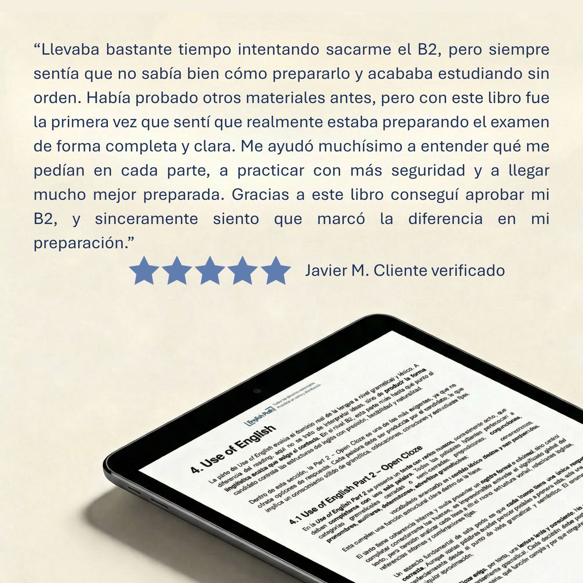 Este ebook está diseñado para que prepares el examen B2 First de forma estructurada y consciente, entendiendo en todo momento qué te piden y cómo responder correctamente.